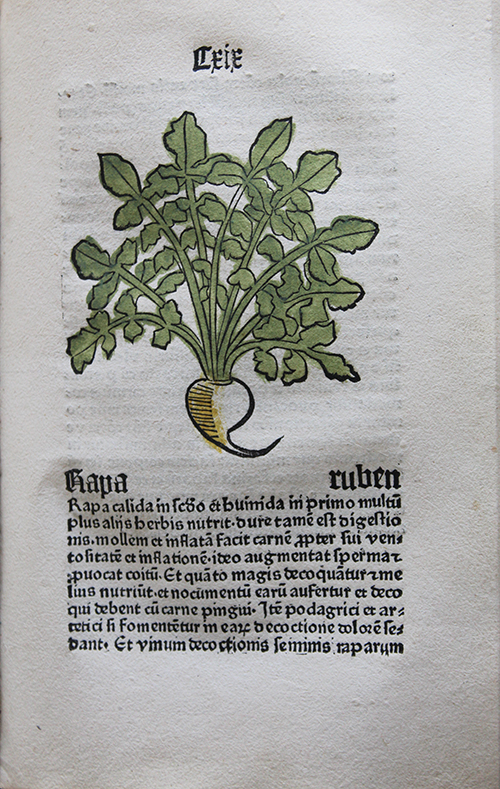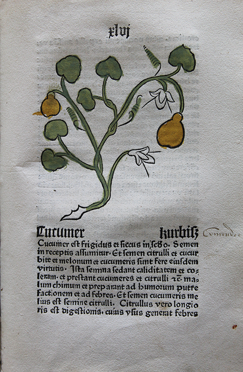Conventionnellement connu sous le titre d’Herbarius latinus, cet ouvrage fait partie des tout premiers herbiers imprimés, et le plus ancien, sans contredit, pour l’Allemagne. Cent cinquante plantes s’y trouvent décrites pour leurs propriétés médicinales, avec, à chaque fois, un bois détaillé, sans fantaisie mais soigneusement enluminé, permettant de reconnaître le sujet dans son milieu naturel. Les noms latins sont traduits en allemand, parachevant le travail d’identification de chacun des végétaux abordés.